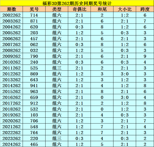 福彩3D积年第262期同时奖号为:714 871 620 203 457 062 032 790 240 525 869 643 941 963 659 912 532 103 706 548 764 220 465。