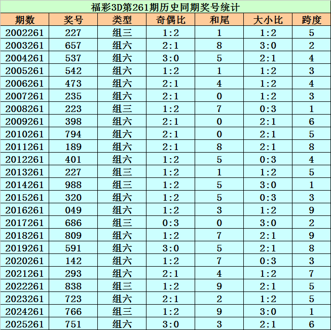 福彩3D积年第261期同时奖号为:227 657 537 542 473 235 223 398 794 189 401 227 988 320 049 686 809 591 142 293 838 723 766 751。