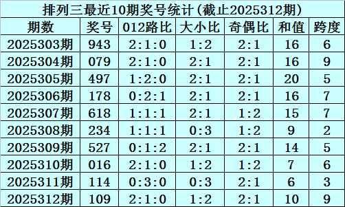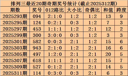 上期纪念:胪列三2025312期奖号为109,奇偶比为2:1,大小比为1:2,跨度为10。