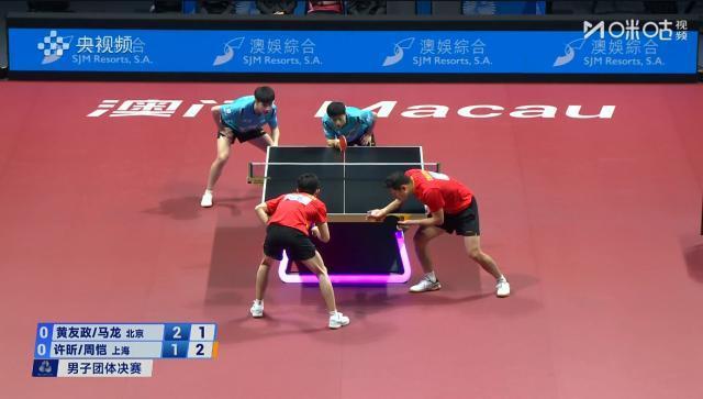 首场男双对决,北京队派出黄友政/马龙出战,上海队派出许昕/周恺出战。最终,黄友政/马龙以3比1的总比分得手,当先为北京队拿下本场比赛的第1分,四局比分诀别为11比9、5比11、11比4、11比7。