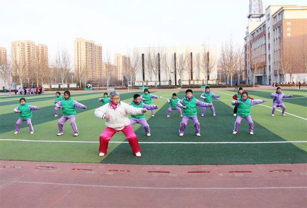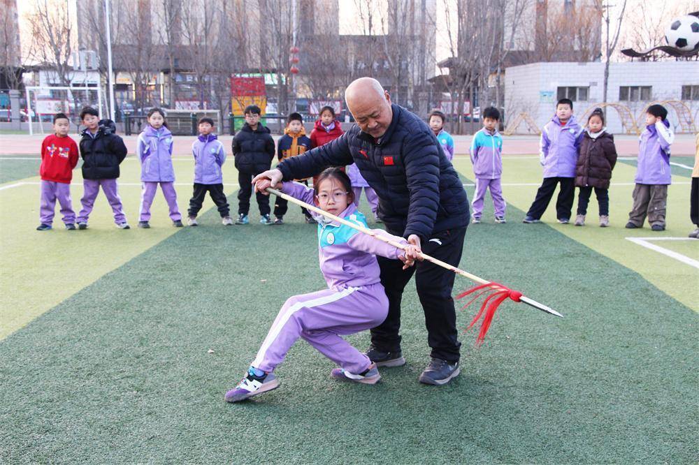 1月21日,在高阳县西街小学操场,常敏杰赤诚指导孩子进行技击检会。杨瀰摄