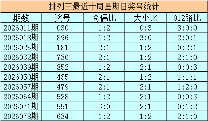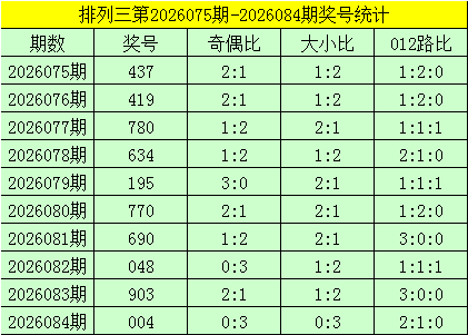开奖转头:胪列三第2026084期奖号为:004,其奇偶比为0:3,大小比为0:3,奖号012路比为2:1:0。
